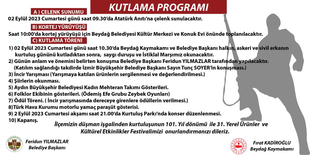 “Beydağ’ın kurtuluşunun 101’inci yıl dönümünü kutlamanın gururunu yaşıyoruz. Beydağ’ın kurtuluş günü olan 2 Eylül günü, her yıl ilçemizin geçmişteki kahramanlığını, direnişini ve özgürlük sevdasını yüreklerimizde yeniden alevlendiriyor.